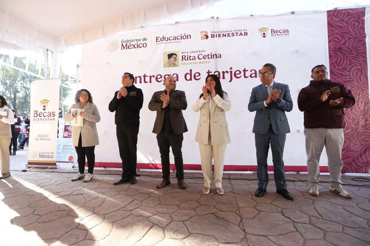Como parte de las acciones del Gobierno de México para fortalecer la permanencia escolar y apoyar la economía de las familias, esta mañana se llevó a cabo en la Alcaldía Iztacalco la entrega de más de 4 mil 200 tarjetas correspondientes a la Beca Universal de Educación Básica “Rita Cetina”, dirigida a estudiantes de nivel básico, con la cual cada beneficiario recibirá un apoyo económico de 1,900 pesos de manera bimestral. En esta ocasión, las tarjetas incluyen un pago retroactivo de 5,700 pesos, correspondiente a los bimestres anteriores, garantizando que los jóvenes reciban el respaldo completo desde su ingreso al programa.